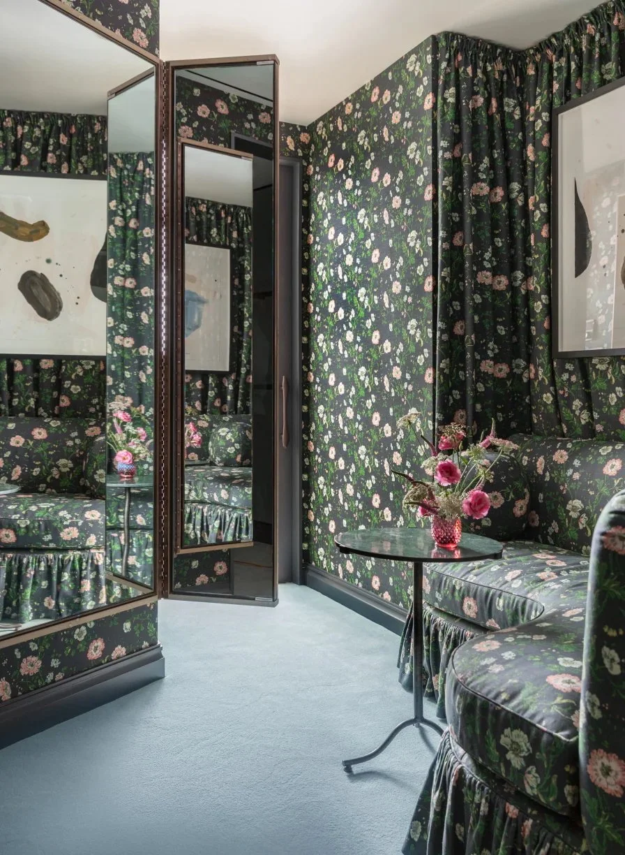 Recolored print used as wallpaper and upholstery fabric for Tuckernuck's New York Store VIP shopping suite.