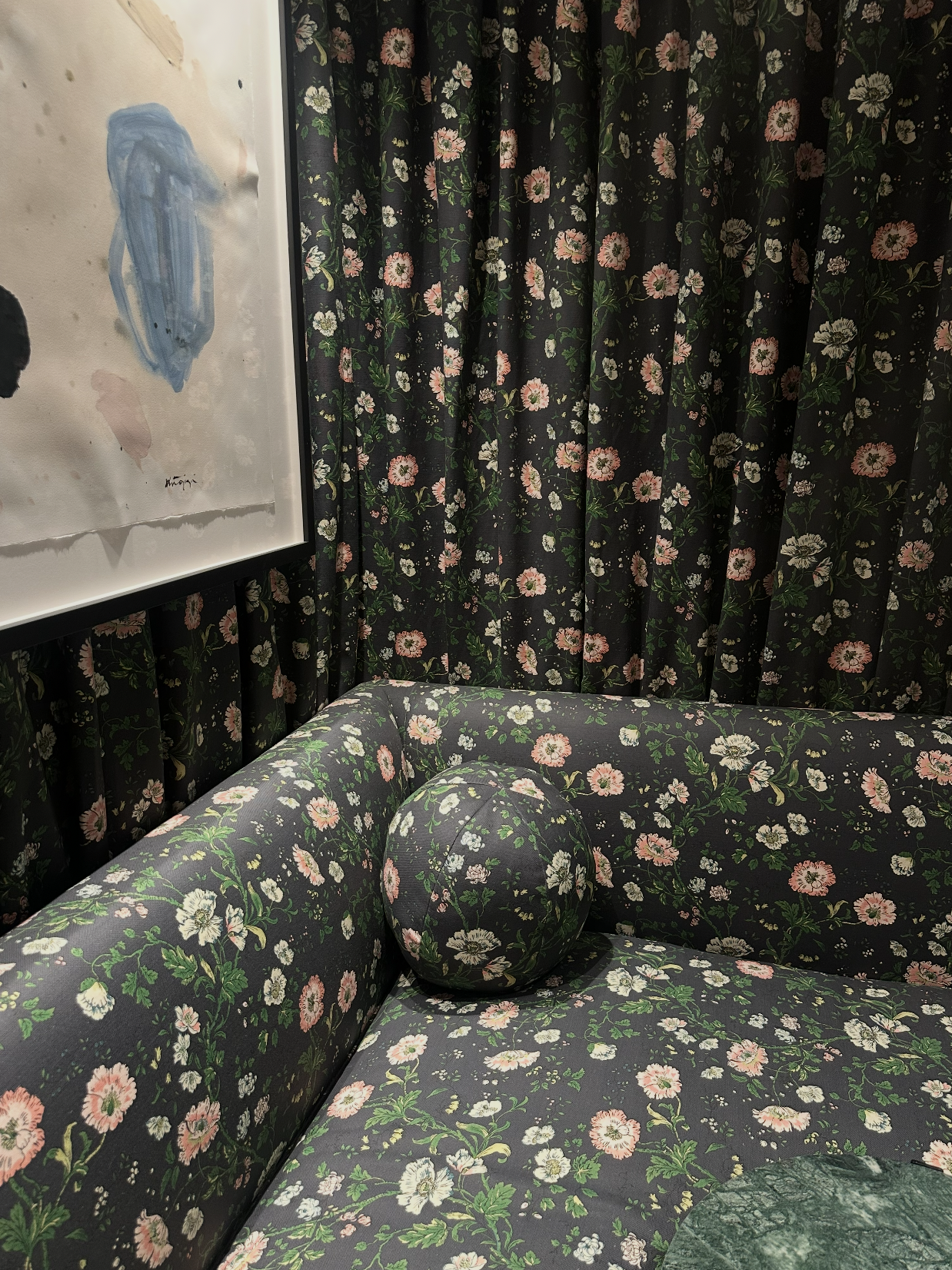 Vintage print recolor used as wallpaper and upholstery fabric for Tuckernuck's New York Store VIP shopping suite.
